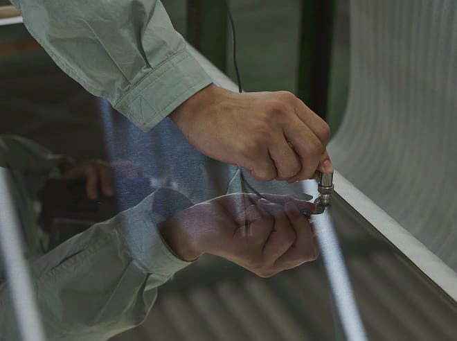 南陽工場では、表面を削り直線や曲線模様を施したり、鏡面のように美しく磨き上げたりする「意匠性研磨」と、特殊な研磨技術を用いて本来持つステンレスの機能性を向上させたり、新たな機能を付与する「機能性研磨」を行っています。