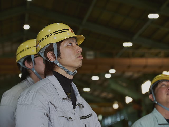 構内業務部は、自動研削機、天井クレーンやフォークリフトを操る作業が多く4組3交代をこなしている。機械操作が好きでチームで仕事を進めていくタイプに向いている。